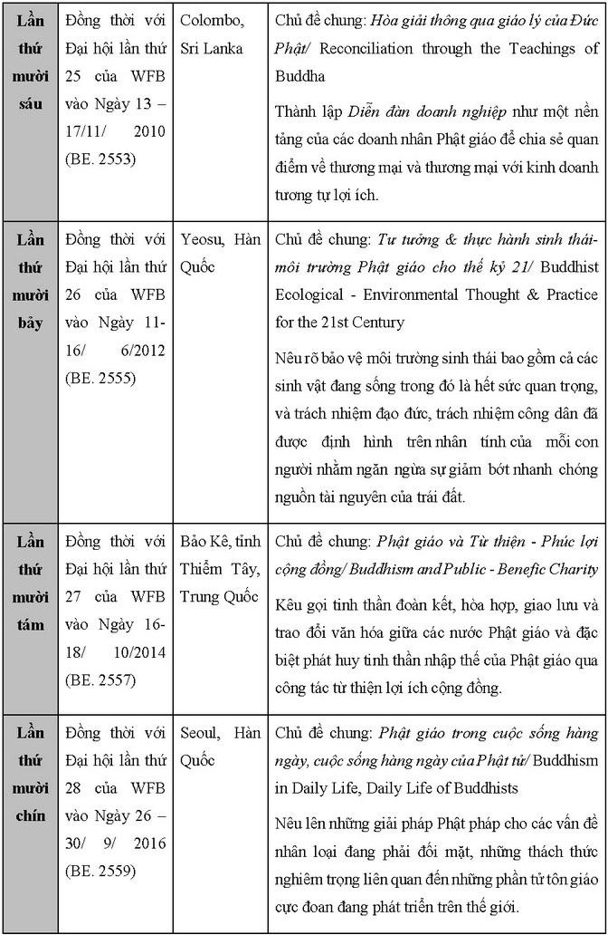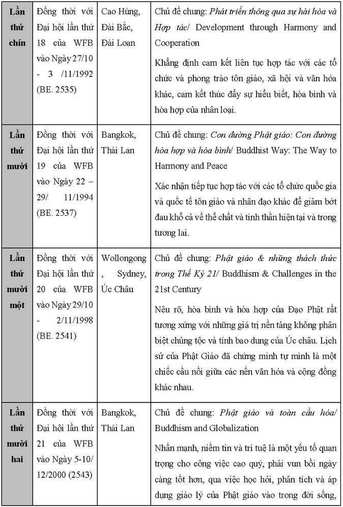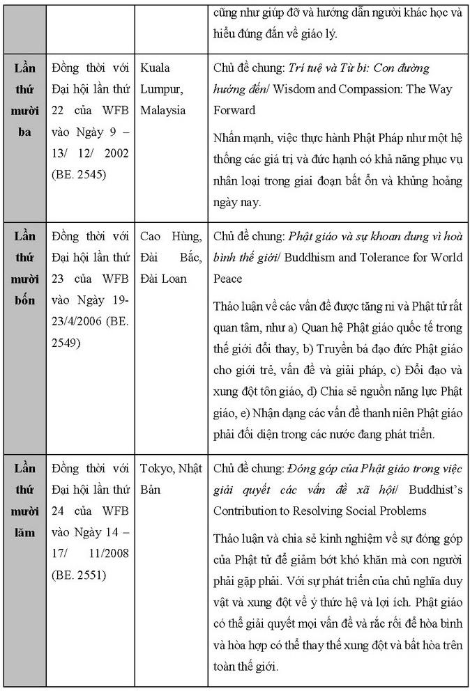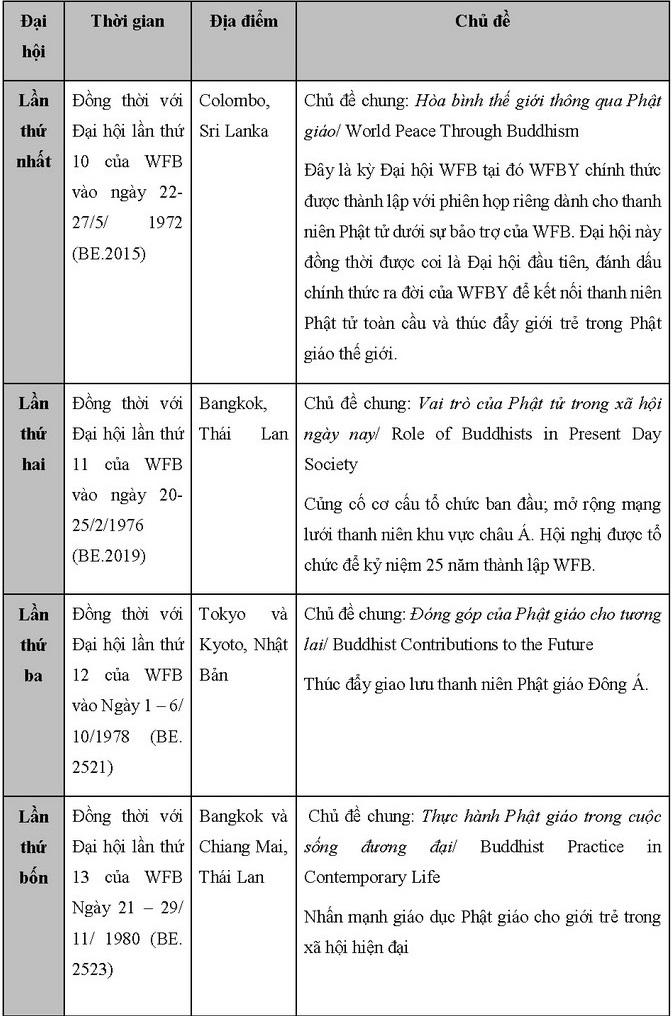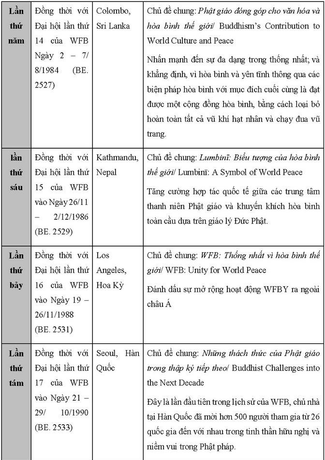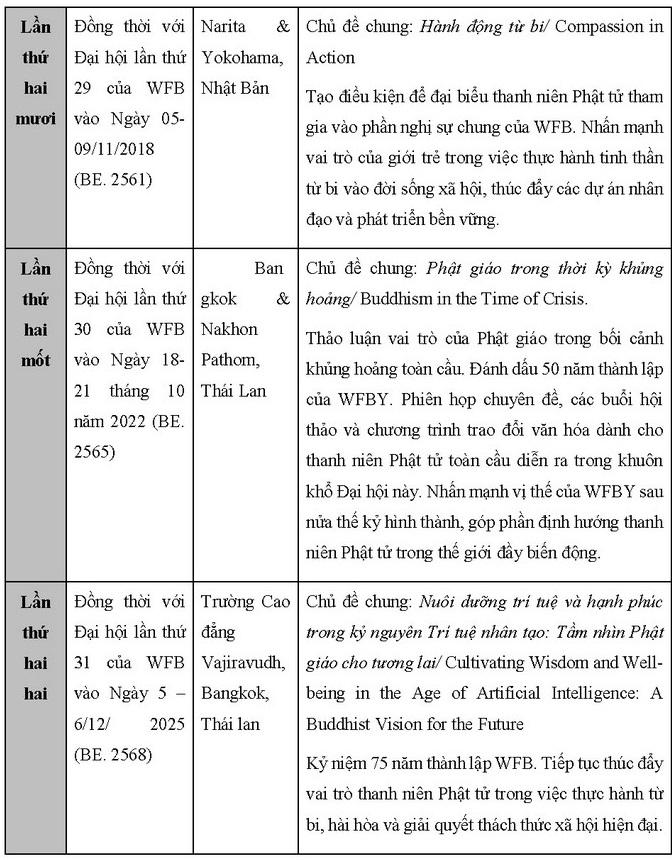 4. Đặc điểm và bản chất tổ chức các Đại hội WFBY4.1 Đồng tổ chức với Đại hội WFBTất cả các kỳ Đại hội đồng WFBY đều diễn ra song song với Đại hội đồng WFB, nghĩa là giới thanh niên phật tử tham gia cùng hệ thống đại biểu lớn hơn của WFB. Điều này mang lại ưu thế tiếp cận và thảo luận cùng các lãnh đạo Phật giáo quốc tế; đảm bảo tiếng nói thanh niên phật tử được lồng ghép trong các nghị quyết chung về phát triển Phật giáo và nhân loại; và khuyến khích hợp tác giữa các tổ chức thanh niên Phật giáo quốc tế thông qua mạng lưới WFBY. 4.2 Nội dung nghị sự thanh niênMặc dù thông tin chi tiết từng chương trình nội bộ Đại hội WFBY thường không được công bố rộng rãi như nghị trình WFB, các chủ đề và hoạt động thanh niên thường bao gồm: Các phiên thảo luận chuyên đề liên quan đến vai trò thanh niên phật tử trong xã hội toàn cầu; trao đổi văn hóa và giáo dục giữa các thành viên từ những quốc gia và truyền thống Phật giáo khác nhau; chia sẻ dự án nhân đạo - xã hội do thanh niên Phật giáo tổ chức trong nước và quốc tế. Đây là phần nội dung quan trọng phản ánh sứ mệnh của WFBY trong việc kết nối và phát huy vai trò năng nổ của giới trẻ Phật giáo toàn cầu. 5. Sự liên hệ và tương tác giữa WFBY và Phật giáo Việt NamThứ nhất, PGVN trong bối cảnh Phật giáo quốc tế. PGVN từ lâu đã có truyền thống tham gia và kết nối với các tổ chức Phật giáo quốc tế; là thành viên của nhiều mạng lưới quốc tế và tham gia sâu rộng các diễn đàn Phật giáo toàn cầu để trao đổi kinh nghiệm hoằng pháp, đối thoại liên tôn và thúc đẩy hòa bình thế giới. Việc này giúp vị thế PGVN không chỉ nằm trong nước mà còn được tôn trọng trong cộng đồng Phật giáo quốc tế. Trong các tài liệu chính thức và báo chí quốc tế hiện hữu, ít có ghi chép trực tiếp về WFBY như một tổ chức chính thức có quan hệ với PGVN, khiến việc minh định cơ chế liên hệ này cần dựa trên các ví dụ hoạt động cụ thể và các tổ chức thanh niên Phật giáo liên quan. Thứ hai, tương tác qua tổ chức thanh niên Phật giáo. Trong phạm vi hoạt động thanh niên Phật giáo quốc tế, WFBY là mạng lưới kết nối các trung tâm thanh niên Phật giáo toàn cầu với mục tiêu thúc đẩy giáo lý Phật giáo trong giới trẻ, hòa bình và hợp tác quốc tế. WFBY hiện có 38 trung tâm tại 18 quốc gia và khu vực trên thế giới, với nhiều hoạt động trao đổi văn hóa – Phật sự giữa các quốc gia thành viên. Mối tương tác gần gũi giữa WFBY và PGVN thể hiện một phần qua đại diện các tổ chức thanh niên PGVN tham gia vào các hoạt động quốc tế của WFBY. Gia Đình Phật Tử Việt Nam (GĐPTVN) được ghi nhận tham dự các đại hội và hoạt động quốc tế có liên quan đến WFBY và cộng đồng thanh niên Phật giáo toàn cầu. Trong Đại hội Huynh trưởng GĐPTVN trên thế giới (nhiệm kỳ IV), ban lãnh đạo WFBY đã gửi lời chúc mừng và đánh giá cao đóng góp của GĐPTVN trong việc quảng bá giáo pháp cho thế hệ trẻ và thúc đẩy quan hệ quốc tế trong cộng đồng Phật giáo. Điều này cho thấy sự hiện diện thực tế của tổ chức thanh niên PGVN trong không gian hoạt động của WFBY, qua đó đóng góp vào mạng lưới thanh niên Phật giáo toàn cầu và tạo cầu nối giữa PGVN với các phong trào tương đồng ở nước ngoài. Thứ ba, gia tăng trao đổi trong khuôn khổ WFB. PGVN là một trong những thành viên sáng lập của tổ chức WFB từ năm 1950, điều này đặt nền tảng cho các mối tương tác mở rộng trong các lĩnh vực con người, tư tưởng, và tổ chức. Thông qua việc PGVN thường xuyên gửi đại biểu tham dự các đại hội WFB và các phiên song song của WFBY, các phật tử người Việt có cơ hội tiếp xúc, học hỏi và chia sẻ kinh nghiệm về giáo dục thanh niên Phật tử với các phái đoàn quốc tế. Phần lớn các báo cáo truyền thông của PGVN thường tập trung vào toàn bộ các hoạt động WFB, việc tổ chức Hội nghị WFBY kéo dài song song với đại hội WFB thể hiện rằng sự liên hệ này không hề tách biệt, và PGVN tham dự các phiên dành cho thanh niên. Thứ bốn, ý nghĩa và hướng phát triển, tăng cường hợp tác đào tạo lãnh đạo trẻ và mở rộng mạng lưới hợp tác khu vực và quốc tế, liên kết với giáo dục Phật pháp và xã hội. Sự liên hệ giữa WFBY và PGVN mở ra cơ hội để đào tạo và phát triển lãnh đạo trẻ trong cộng đồng Phật tử, chuẩn bị cho thế hệ kế thừa có năng lực quốc tế và tinh thần nhân văn sâu sắc. Việc tham gia các chương trình trao đổi, hội nghị giúp thanh niên PGVN mở rộng kiến thức, kỹ năng quản lý dự án, và hiểu biết sâu sắc hơn về Phật giáo trong bối cảnh đa văn hóa. Hiện tại WFBY triển khai các khối khu vực nhằm kết nối chặt chẽ hơn các tổ chức thành viên trong cùng vùng địa lý. Việt Nam có thể tham gia vào các khối này thông qua các tổ chức thanh niên Phật giáo trong nước, tăng cường phối hợp với cá