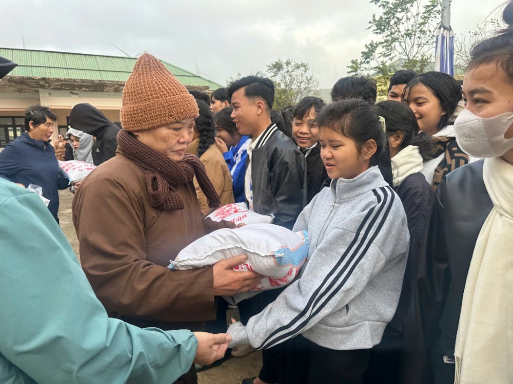Tại đây, đoàn đã trao 350 suất quà đến các em học sinh dân tộc nội trú, mỗi suất trị giá 600.000 đồng, gồm: 10kg gạo, dầu ăn, nước mắm, mì tôm, mì chính, quần áo mới và giày dép. Những phần quà thiết thực góp phần hỗ trợ sinh hoạt hằng ngày, động viên các em yên tâm học tập trong điều kiện còn nhiều thiếu thốn. Chia sẻ tại buổi trao quà, Ni trưởng Thích Đàm Bích nhấn mạnh, việc chăm lo cho học sinh vùng đồng bào dân tộc thiểu số không chỉ là hỗ trợ vật chất, mà còn là sự gieo duyên lành, khơi dậy niềm tin và ý chí vươn lên trong cuộc sống cho thế hệ trẻ.