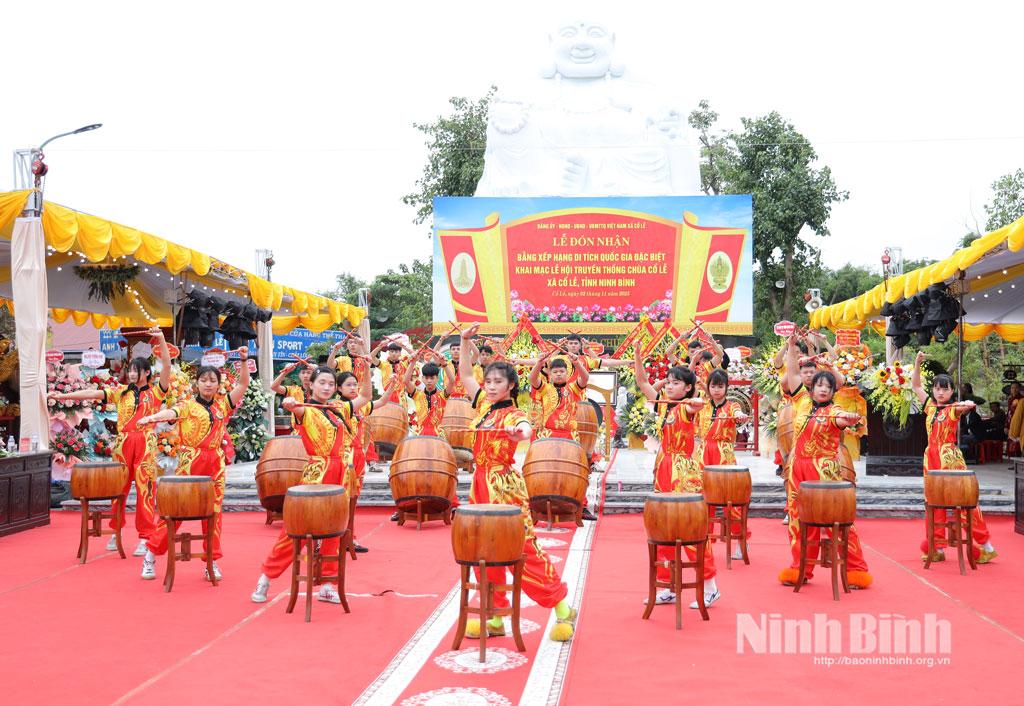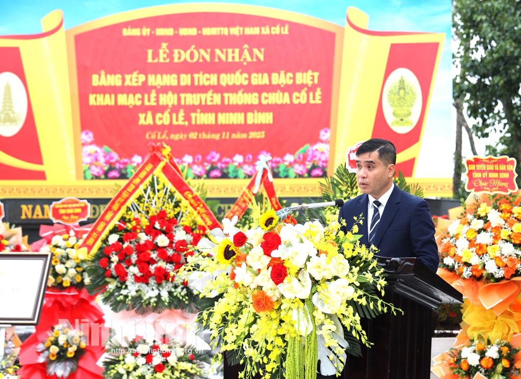 Đồng chí Đặng Xuân Phong, Ủy viên Trung ương Đảng, Bí thư Tỉnh ủy, Trưởng đoàn Đại biểu Quốc hội tỉnh tặng hoa chúc mừng Đảng bộ, Chính quyền và Nhân dân xã Cổ Lễ. Tới dự có các đồng chí: Đặng Xuân Phong, Uỷ viên Trung ương Đảng, Bí thư Tỉnh uỷ, Trưởng Đoàn đại biểu Quốc hội tỉnh; Lê Hải Bình, Uỷ viên dự khuyết Trung ương Đảng, Thứ trưởng Thường trực Bộ Văn hoá, Thể thao và Du lịch; Đinh Thị Lụa, Phó Bí thư Thường trực Tỉnh ủy; Lê Quốc Chỉnh, Phó Bí thư Tỉnh ủy, Chủ tịch HĐND tỉnh; Phạm Quang Ngọc, Phó Bí thư Tỉnh ủy, Chủ tịch UBND tỉnh; Mai Văn Tuất, Phó Bí thư Tỉnh ủy, Chủ tịch Ủy ban MTTQ Việt Nam tỉnh. Cùng dự có lãnh đạo Tổng cục Hậu cần - Kỹ Thuật (Bộ Quốc phòng), Cục Di sản văn hoá (Bộ Văn hoá, Thể thao và Du lịch); các đồng chí Ủy viên Ban Thường vụ Tỉnh uỷ; Uỷ viên Ban Chấp hành Đảng bộ tỉnh; lãnh đạo HĐND, UBND, Ủy ban MTTQ Việt Nam tỉnh; lãnh đạo các sở, ban, ngành, đoàn thể, Ban Trị sự Giáo hội Phật giáo Việt Nam tỉnh cùng đông đảo tăng, ni, phật tử, nhân dân và du khách thập phương. Các đồng chí: Phạm Gia Túc, Uỷ viên Trung ương Đảng, Chánh Văn phòng Trung ương Đảng; Trung tướng Trần Công Chính, Tổng cục trưởng Tổng cục II, Bộ Quốc phòng; Đặng Khánh Toàn, Phó Chánh Văn phòng Trung ương Đảng đã gửi lẵng hoa chúc mừng Đảng bộ, Chính quyền và Nhân dân xã Cổ Lễ. Chùa Cổ Lễ là công trình Phật giáo nổi tiếng được khởi dựng từ thế kỷ XII, gắn liền với công lao của Đức Thánh tổ Nguyễn Minh Không. Đức Thánh tổ Nguyễn Minh Không xuất thân bình dân; từ nhỏ, ngài nổi tiếng thông minh, học giỏi, là người thông hiểu đạo Phật, kiến thức uyên bác; là bậc cao tăng sáng lập nhiều ngôi chùa ở Việt Nam và là ông tổ nghề đúc đồng của Việt Nam, có y thuật chữa bệnh cứu dân, đã chữa khỏi bệnh cho vua Lý Thần Tông và được nhà vua phong làm Quốc sư. Chùa Cổ Lễ có nhiều nét khác với chùa cổ Việt Nam bởi sự kết hợp khéo léo các yếu tố kiến trúc cổ truyền với kiến trúc Gô tích (phong cách kiến trúc thịnh hành ở phương Tây giai đoạn thế kỷ XII đến thế kỷ XVI). Chùa là một chỉnh thể gồm nhiều công trình kiến trúc khác nhau, trải rộng theo hướng Đông - Tây như: Tháp Cửu phẩm liên hoa, cầu cuốn, Tam quan, Phật giáo Hội quán, Đền thờ Đức thánh Trần, Phủ Mẫu, chùa chính, gác chuông “Kim Chung Bảo Các”... Trong đó, công trình kiến trúc có giá trị nghệ thuật cao là tháp Cửu phẩm liên hoa có 9 tầng mang ý nghĩa “cửu trùng” - một đặc thù tín ngưỡng của Đạo Phật Thích Ca. Hiện nay, Chùa lưu giữ được nhiều di vật văn hoá quý hiếm như: 100 pho tượng với các chất liệu gỗ, đồng, đá của nhiều giai đoạn lịch sử khác nhau và 313 bia đá. Bên cạnh đó, Chùa còn lưu giữ quả chuông “Thần Quang tự chung” được đúc năm Kỷ Mùi, niên hiệu Cảnh Thịnh 7 (năm 1799) và 4 thuyền chải, dùng để thi bơi trong lễ hội truyền thống. Không chỉ có ý nghĩa lịch sử, văn hóa, kiến trúc, Chùa Cổ Lễ còn là di tích cách mạng. Trong hai cuộc kháng chiến chống Pháp và chống Mỹ, từ nơi đây nhiều nhà sư đã tạm biệt “cửa thiền” cầm súng ra trận. Đặc biệt, ngày 27/2/1947, tại chùa, dưới sự chủ trì của Hòa thượng Thích Thế Long, chính quyền địa phương, các tín đồ phật tử và nhân dân trong vùng đã tổ chức lễ phát nguyện cho 27 nhà sư cởi áo cà sa lên đường tòng quân đánh giặc, bảo vệ Tổ quốc. Trong đó Hòa thượng Thích Thế Long sau này giữ chức Phó Chủ tịch Thường trực Hội đồng Trị sự Giáo hội Phật giáo Việt Nam, Phó Chủ tịch Quốc hội khóa VII. Hàng năm, Lễ hội chùa Cổ Lễ diễn ra từ ngày 13 đến 16/9 âm lịch với rất nhiều hoạt động văn hóa tín ngưỡng truyền thống và các tiết mục diễn xướng, trò chơi dân gian. Lễ hội truyền thống Chùa Cổ Lễ đã được đưa vào Danh mục Di sản văn hoá phi vật thể Quốc gia. Về với Lễ hội Chùa Cổ Lễ, du khách thập phương không chỉ tận mắt chiêm ngưỡng một công trình kiến trúc nghệ thuật độc đáo, tưởng nhớ tới Quốc sư - Đức Thánh tổ Nguyễn Minh Không, mà còn để lễ Phật, đắm mình trong cõi tâm linh hướng tới “chân - thiện - mỹ”. Với những giá trị tiêu biểu về lịch sử, văn hóa và kiến trúc nghệ thuật, năm 1988, Chùa Cổ Lễ được Bộ Văn hoá (nay là Bộ Văn hoá, Thể thao và Du Lịch) xếp hạng Di tích Kiến trúc nghệ thuật cấp Quốc gia. Ngày 11/9/2025, Thủ tướng Chính phủ đã ký Quyết định số 1959 xếp hạng Chùa Cổ Lễ, xã Cổ Lễ, tỉnh Ninh Bình là Di tích Quốc gia đặc biệt. ![]() Tại buổi lễ, đồng chí Phạm Định Phong, Phó Cục trưởng Cục Di sản văn hóa (Bộ Văn hóa, Thể thao và Du lịch) đã công bố Quyết định của Thủ tướng Chính phủ xếp hạng Di tích Quốc gia đặc biệt Chùa Cổ Lễ. ![]() Đồng chí Thứ trưởng Thường trực Bộ Văn hoá, Thể thao và Du lịch Lê Hải Bình trao Bằng xếp hạng Di tích Quốc