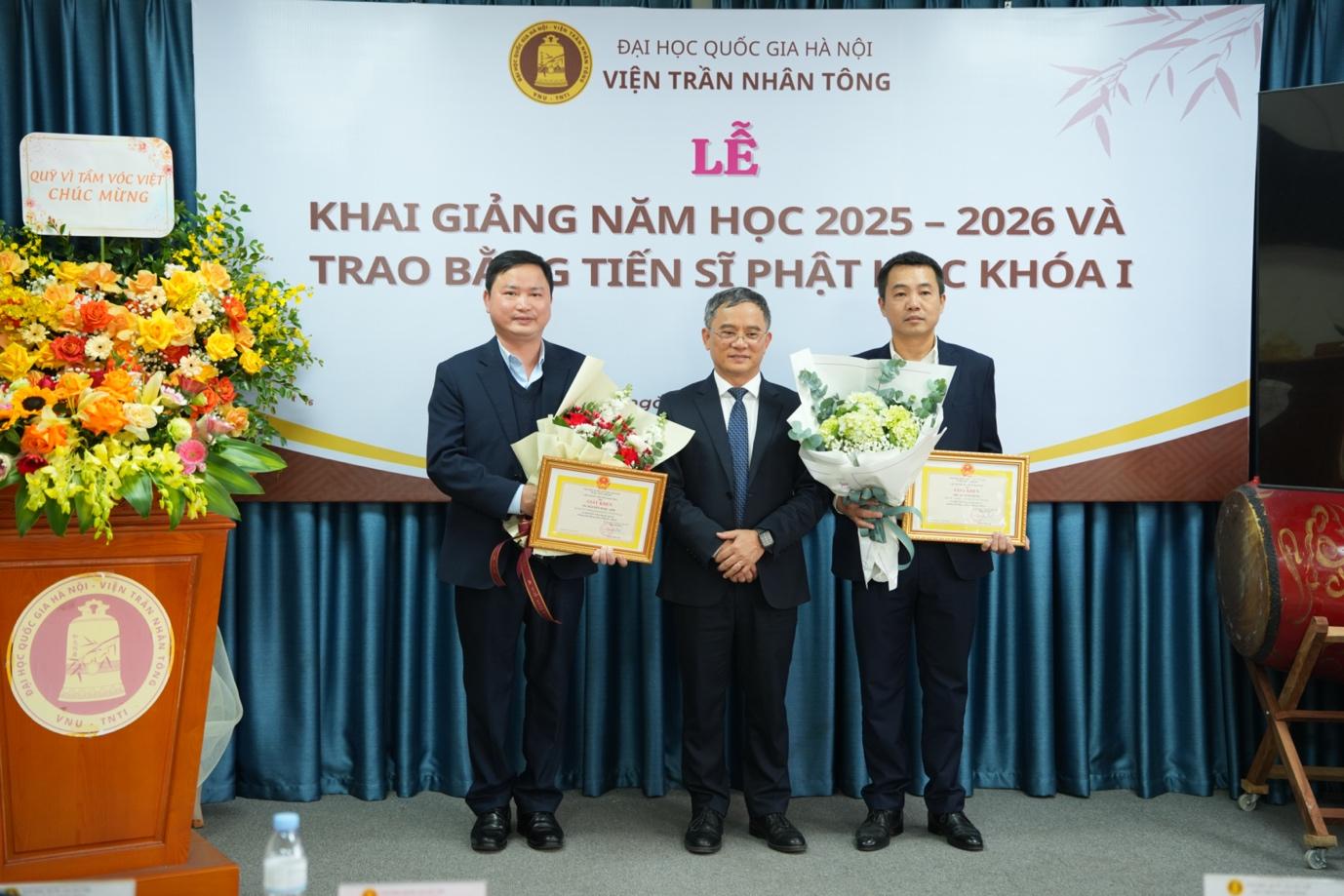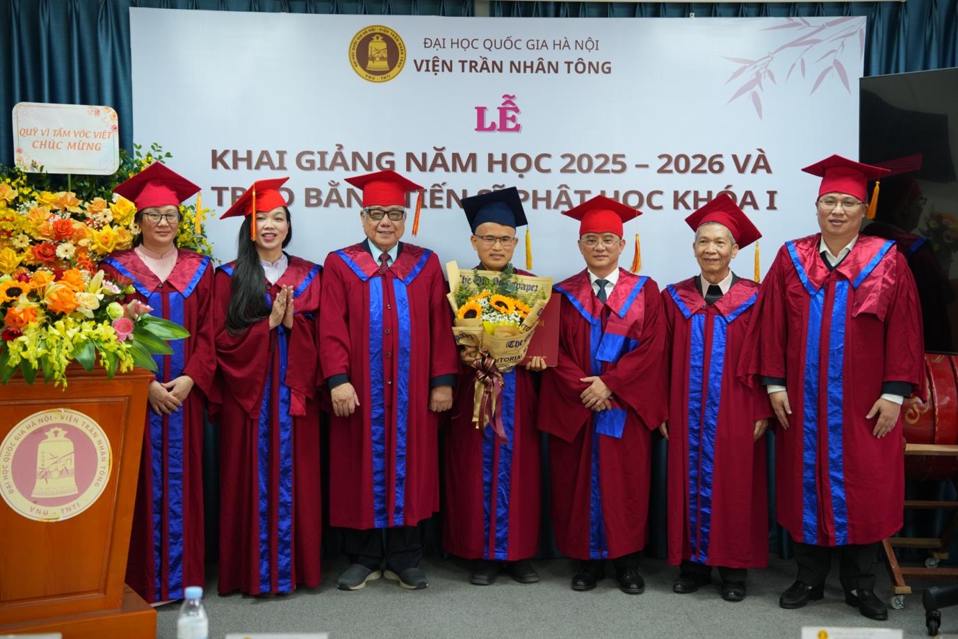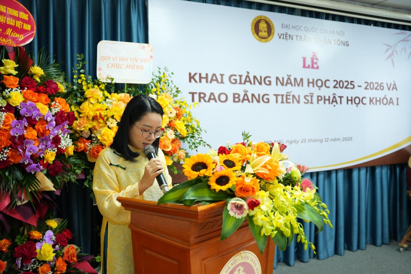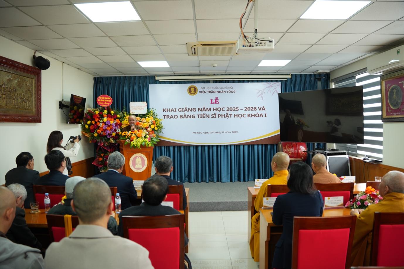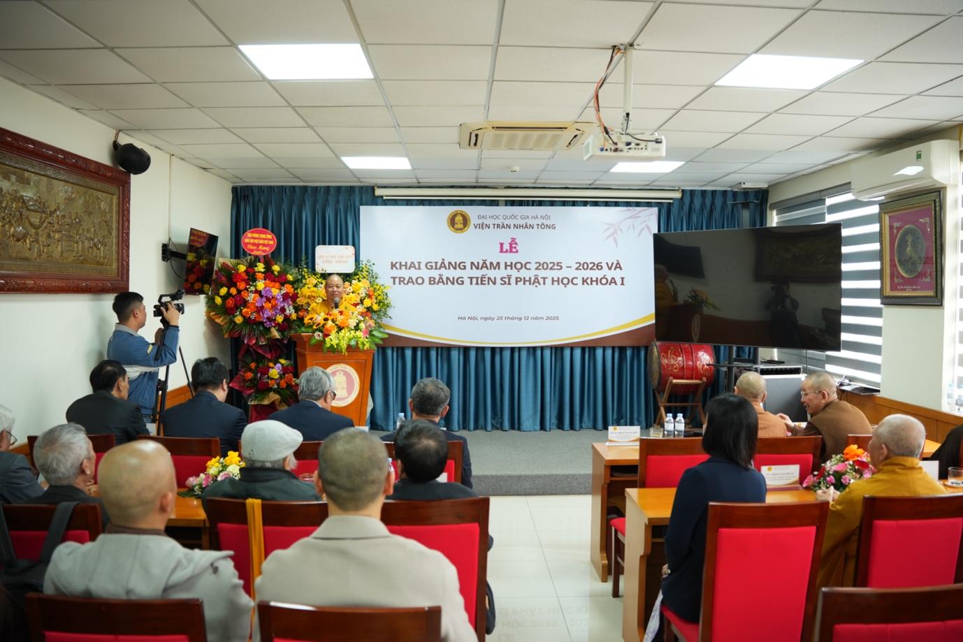 Phát biểu khai giảng năm học 2025–2026, PGS.TS. Nguyễn Tiến Vinh, Viện trưởng Viện Trần Nhân Tông nhấn mạnh: lễ khai giảng năm nay mang ý nghĩa đặc biệt khi được tổ chức đồng thời với việc trao Bằng Tiến sĩ Phật học đầu tiên của Viện – một cột mốc có tính lịch sử đối với Phật học Việt Nam trong hệ thống giáo dục đại học quốc dân. Theo Viện trưởng, đây không chỉ là sự ghi nhận thành quả đào tạo sau nhiều năm nỗ lực, mà còn là minh chứng cho tính đúng đắn của định hướng phát triển Phật học theo con đường học thuật chính quy, bài bản và hội nhập.