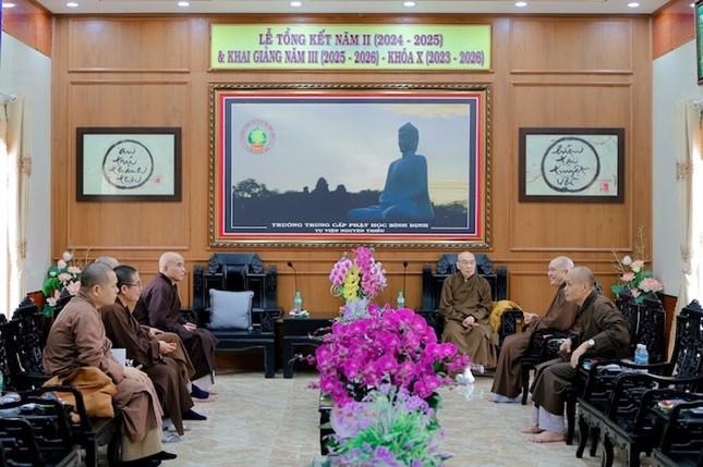 Đoàn do Hòa thượng Thích Quang Nhuận, Thành viên Hội đồng Chứng minh, Thành viên Hội đồng Chỉ đạo kiêm Trưởng ban Bảo trợ Học viện làm trưởng đoàn; Thượng tọa Thích Nguyên Thành, Ủy viên Hội đồng Trị sự, Phó Trưởng ban Giáo dục Phật giáo T.Ư; Thượng tọa Thích Nguyên Đạt, Ủy viên Hội đồng Trị sự, Phó Trưởng ban Giáo dục Phật giáo T.Ư, Phó Viện trưởng kiêm Trưởng Phòng Sau Đại học Học viện; cùng chư tôn đức trong Hội đồng Điều hành Học viện tham gia đoàn. Trong buổi thăm hỏi, Hòa thượng trưởng đoàn đã có lời sách tấn đến Tăng Ni sinh, nhấn mạnh việc giữ vững chí nguyện tu học, trau dồi giới hạnh và kiến thức Phật pháp. Hòa thượng đồng thời khuyến tấn các học Tăng, học Ni phát huy truyền thống tu học, rèn luyện tinh thần kiên nhẫn, đoàn kết và từ bi để vượt qua khó khăn sau thiên tai; tán thán đến lãnh đạo Ban Giám hiệu đã tận tâm và tận lực trong sứ mệnh giáo dục các thế hệ Tăng Ni, mà danh tiếng và sự uy tín của ngôi trường Trung cấp Phật học Nguyên Thiều đã được lan toả, quy tụ số lượng Tăng Ni sinh các tỉnh thành về học tập qua mỗi khóa.