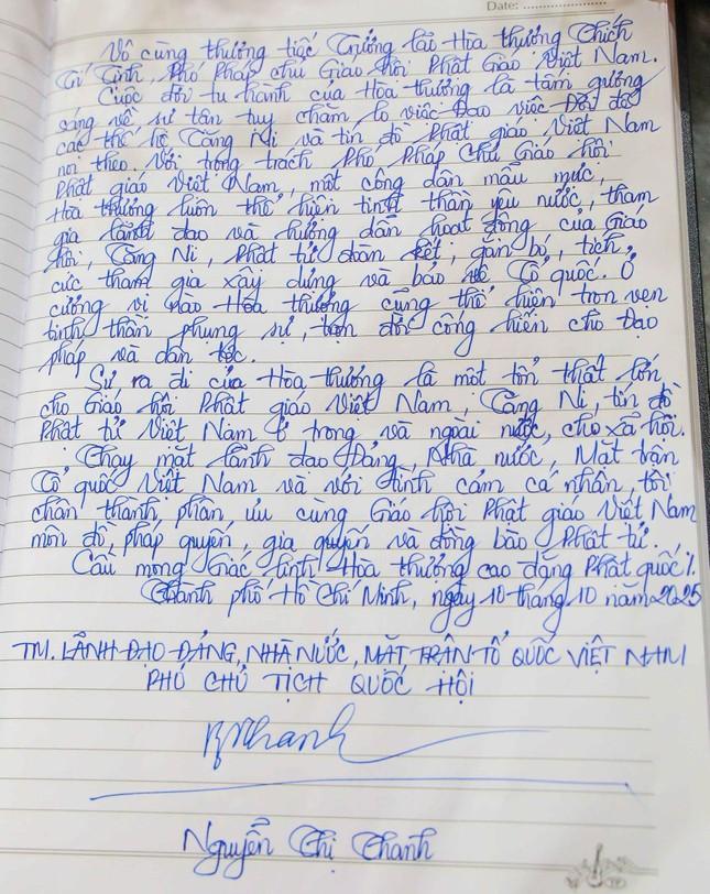 Đón tiếp phái đoàn có chư vị Phó Chủ tịch Hội đồng Trị sự GHPGVN: Hòa thượng Thích Huệ Thông, Thượng tọa Thích Thanh Phong; Thượng tọa Thích Phước Nguyên, Phó Tổng Thư ký Hội đồng Trị sự kiêm Chánh Văn phòng II; cùng môn đồ pháp quyến. Trước Giác linh đường, Phó Chủ tịch Quốc hội Nguyễn Thị Thanh cùng phái đoàn đã dâng hương, nhiễu kim quan và viết sổ tang tưởng niệm Trưởng lão Hòa thượng Thích Trí Tịnh.