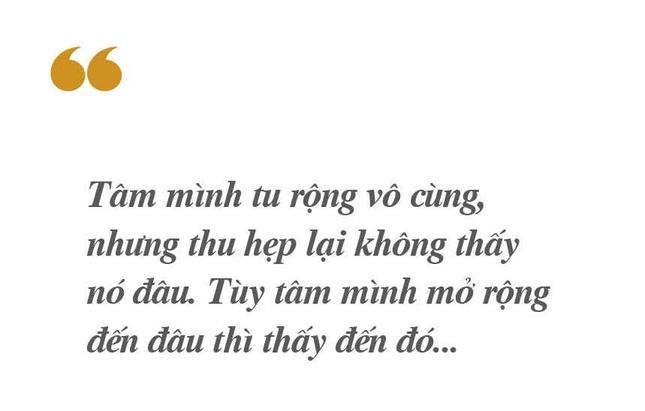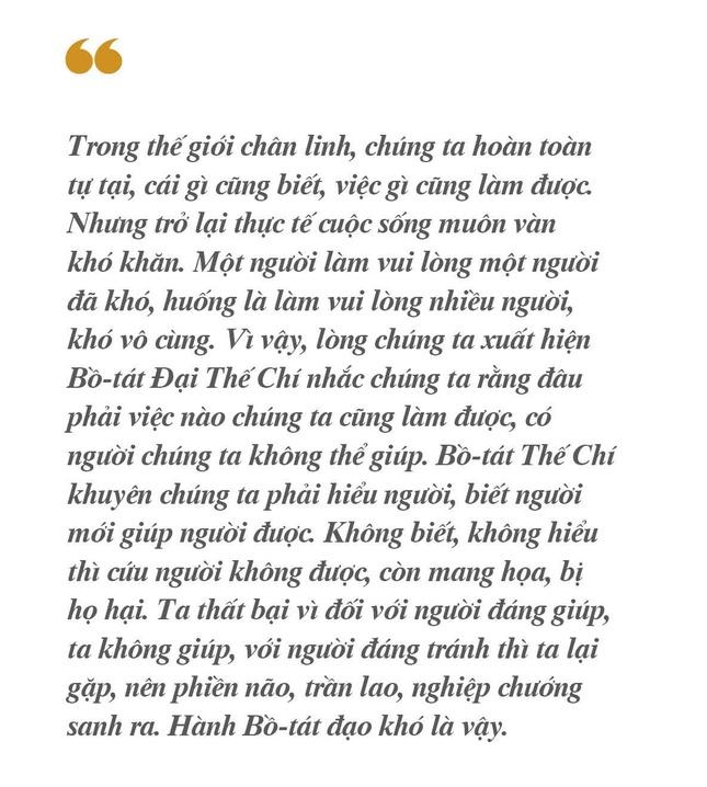 Tâm mình tu rộng vô cùng, nhưng thu hẹp lại không thấy nó đâu. Tùy tâm mình mở rộng đến đâu thì thấy đến đó, đầu tiên thấy Phật và Thánh chúng, Bồ-tát cứ lần lần mở rộng cho đến thấy cả pháp giới chúng sanh là mình đã thâm nhập thế giới Pháp hoa, mới hiểu ý nghĩa hoa Mạn-đà-la, hoa Mạn-thù-sa. Nghĩa là tâm chúng ta hoàn toàn trong sạch và trí chúng ta hoàn toàn sáng suốt khiến cho chúng ta thấy những hiện tượng mầu nhiệm trong trời đất. Hoa Mạn-đà-la tiêu biểu cho tâm an vui, thấy được hoa trời mà không có hoa là thấy hoa xuân nở trong lòng chúng ta. Từ đó, thiền sư diễn tả ý này bằng câu đơn giản rằng con đã về, con đã tới. Nhưng ít người nhận ra ý nghĩa đích thực của câu này, đã về là về đâu, đã tới là tới đâu? Đối với tôi, mình đã về chốn cũ là chân linh của mình, đã tới là tới cùng tột của tri thức, tức trí tuệ của mình. Tôi quyết lòng tìm đến Linh sơn, nói cách khác là tìm đến chân linh. Nhưng trì kinh Pháp hoa, đối trước thực tế cuộc sống có muôn ngàn khó khăn, nguy hiểm chờ đón mình, thì phải làm sao? Bỗng tôi chợt nhận ra chân linh chúng ta vô động, đứng yên, tất yếu chúng ta phải dừng tâm lại, để tâm lắng yên sẽ nghe được pháp Như Lai và tâm mình sáng ra mới thấy con đường đạo của mình quá an lành, nhờ có Bồ-tát Quan Âm, Thế Chí dẫn đường. Đây là tâm đắc của tôi khi trì kinh Pháp hoa nhận ra được. Nhưng đi xa hơn, quán sát kỹ thấy không phải hai vị Bồ-tát này là hai con người dẫn mình đi. Vì tâm lắng yên, thì mình và người đều không có. Bấy giờ, Bồ-tát là Bồ-tát tâm, Bồ-tát chân linh. Bồ-tát Quan Âm và Đại Thế Chí là chân linh, mình cũng là chân linh, nên chân linh gặp nhau, hay tâm hồn lớn gặp nhau. Vì vậy, có hai vị Bồ-tát này dẫn đường chúng ta hết sợ. Bồ-tát Quan Âm còn có tên là Quán Tự Tại, đối với các pháp, Ngài hoàn toàn tự tại. Và hạnh của Ngài là lóng nghe tất cả tiếng kêu cứu của chúng sanh, Ngài khởi đại bi tâm cứu khổ ban vui. Và mình cũng nhìn chúng sanh bằng chân linh của mình, thấy chúng sanh trầm luân đau khổ, mình khởi ý thương xót, cứu đời giúp người giống với hạnh Quan Âm. Và Quan Âm này khởi từ lòng chúng ta và chúng ta hiện hữu trên cuộc đời cũng phát xuất từ lòng chúng ta. Ta khởi tâm như thế và mọi người nhìn ta, nghĩ ta là Quan Âm, điều này cũng lạ. Mới tu, ta nghĩ mình là chúng sanh đau khổ, nên lạy Quan Âm để cầu Ngài phò hộ chúng ta. Nhưng ngược lại, người nghĩ ta là Quan Âm có thể cứu được họ. Quan Âm này từ tâm chúng ta mà hình thành. Đó là con đường thứ nhất đi vào trần ai bằng tâm Bồ-tát, thương người cứu đời, nên mọi người thấy thương ta. Còn ta nhiều tham vọng, ham muốn của ta sẽ đụng chạm với ham muốn của người, sanh ra oán thù hại nhau. Trong thế giới chân linh, chúng ta hoàn toàn tự tại, cái gì cũng biết, việc gì cũng làm được. Nhưng trở lại thực tế cuộc sống muôn vàn khó khăn. Một người làm vui lòng một người đã khó, huống là làm vui lòng nhiều người, khó vô cùng. Vì vậy, lòng chúng ta xuất hiện Bồ-tát Đại Thế Chí nhắc chúng ta rằng đâu phải việc nào chúng ta cũng làm được, có người chúng ta không thể giúp. Bồ-tát Thế Chí khuyên chúng ta phải hiểu người, biết người mới giúp người được. Không biết, không hiểu thì cứu người không được, còn mang họa, bị họ hại. Ta thất bại vì đối với người đáng giúp, ta không giúp, với người đáng tránh thì ta lại gặp, nên phiền não, trần lao, nghiệp chướng sanh ra. Hành Bồ-tát đạo khó là vậy. Phật Thích Ca biết rõ người, nên Ngài cứu họ được. Điển hình Phật độ Vô Não là tên sát nhân điên cuồng chém chết cả ngàn người. Ai cũng khiếp sợ hắn, kể cả vua Ba Tư Nặc cũng phải sợ. Nhưng Phật hiểu Vô Não nên Ngài độ sát nhân này trở thành La-hán một cách dễ dàng. Trở lại việc trì kinh Pháp hoa ở giai đoạn hai, trong đầu tôi lóe lên tia sáng mà tôi diễn tả là Quan Âm, Thế Chí dẫn đường. Từ đó, tôi nhận ra trì kinh Pháp hoa bằng tâm, không bằng tiếng đọc. Sở đắc này quan trọng, vì từ đây có cách tu hoàn toàn khác. Lúc trước, tôi hay thực tập pháp bế quan là đóng kín sáu giác quan lại. Vì sáu căn tiếp xúc với sáu trần, vô số tội lỗi, trần lao, nghệp chướng nhân đây sanh ra. Thí dụ đơn giản, như sắc đụng chạm với sắc sẽ sanh ra thọ uẩn. Nếu tu theo Nguyên thủy, thực tập để xóa được sự tác động của hai uẩn này cũng gay go lắm, không đơn giản. Chúng ta tu theo pháp căn bản, Phật dạy rằng do căn không có và trần cũng mất nên chúng ta nhập Không môn. Tất cả người tu tìm đường giải thoát đều đi vô cửa này. Tôi cũng vô cửa này, nhưng sau khi thâm nhập được cốt tủy Pháp hoa là về tới chân linh, gặp Phật thì khác hẳn. Trước tu theo Nguyên thủy, chúng ta không cho mắt tiếp xúc với cảnh thì không thấy. Nhưng tu theo Pháp hoa, trong phẩm Pháp sư công