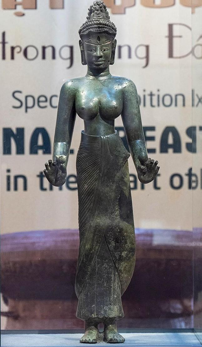 Với ông Trần Kỳ Phương, nhà nghiên cứu văn hóa - nghệ thuật Chămpa, người theo dõi câu chuyện này từ những ngày đầu, sự trở về ấy mang ý nghĩa đặc biệt. "Đây không chỉ là việc khôi phục một cổ vật, mà là khép lại một cuộc lưu lạc dài, mở ra trang mới cho bảo vật quốc gia.", ông nói. Phát hiện tình cờ dưới chân tháp cổ Năm 1978, người dân làng Đồng Dương - một trong những trung tâm Phật giáo lớn nhất Đông Nam Á thế kỷ 9 (thuộc xã Bình Định Bắc, huyện Thăng Bình, tỉnh Quảng Đà) khi đào gạch Chăm ở làng Đồng Dương để làm sân phơi lúa cho hợp tác xã. Họ bất ngờ chạm phải một khối kim loại lớn, phủ rêu xanh, nằm sâu độ chừng ba mét cách tháp Sáng khoảng 20m về phía nam. Đó là pho tượng đồng đứng thẳng, dáng người mềm mại, vòng eo thắt, mái tóc búi cao được tạo hình tinh xảo. Tượng cao 114cm, nặng 81kg. "Người dân lúc ấy tưởng là vàng", ông Phương kể. Để kiểm chứng, họ bẻ các ngón tay và tháo hai pháp khí mang đến tiệm kim hoàn. Kết quả cho thấy tượng được đúc bằng đồng. Khi đó đất nước vừa thống nhất, chưa có quy định rõ ràng về việc phát hiện cổ vật phải bàn giao. Pho tượng được công an xã đưa về trụ sở, nhưng hai pháp khí thì không. Những chi tiết bị tháo rời được truyền tay cất giữ trong dân làng, từ đời chủ tịch xã này sang đời khác, như "gia bảo". Các ngón tay gãy rời dần thất lạc.