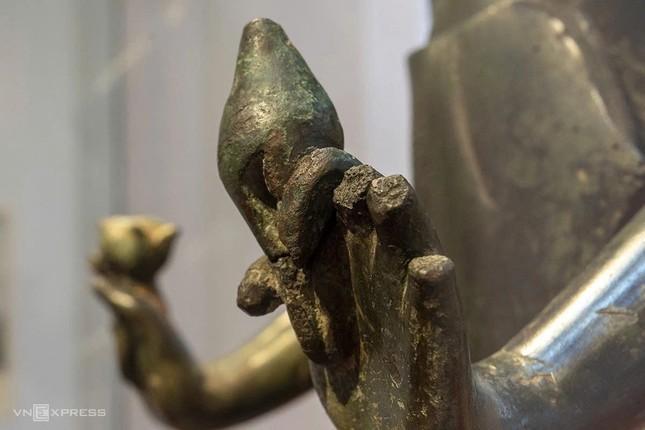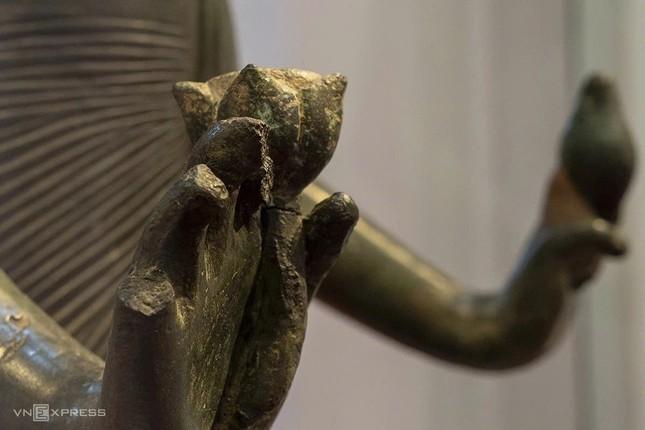 Tượng Bồ-tát Tara, bảo vật quốc gia hơn 1.200 năm tuổi, lần đầu xuất hiện trước công chúng với đầy đủ hai pháp khí: đóa sen và con ốc - Ảnh: Nguyễn Đông/VNE Ngày 19-11-2025, Bảo tàng Điêu khắc Chăm Đà Nẵng trưng bày tượng Bồ-tát Tara trong diện mạo gần với nguyên bản nhất từ trước đến nay. Hai pháp khí bị thất lạc suốt nhiều thập niên được gắn tạm bằng vật liệu trung tính, không ảnh hưởng đến đồng, giúp người xem hình dung trọn vẹn vóc dáng của một kiệt tác Phật giáo Chămpa.