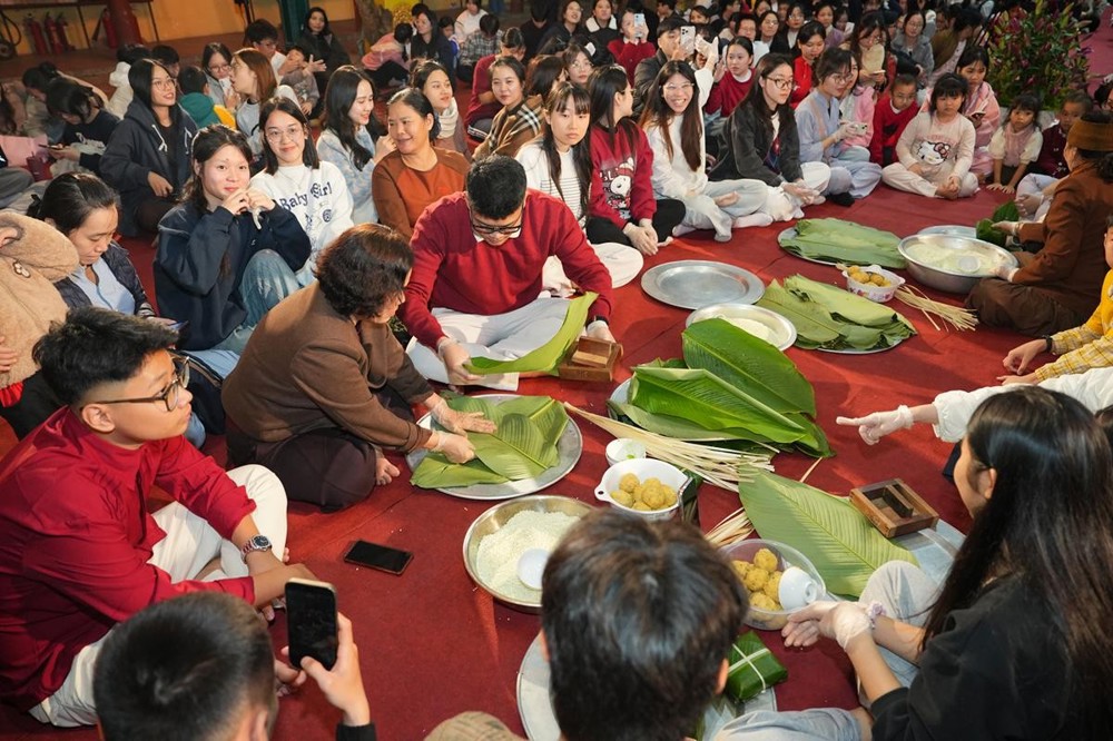 Sau bữa cơm thân mật và lễ khai mạc khóa tu, các khóa sinh được Phật tử Hoa Đức Hà – đại diện Ban Công quả chùa Bằng trực tiếp hướng dẫn thực hành gói bánh chưng. Đây không chỉ là một hoạt động mang đậm giá trị văn hóa truyền thống của dân tộc Việt Nam mỗi độ Tết đến, Xuân về, mà còn là dịp để người trẻ chạm vào chiều sâu của nếp sống gia đình, của tinh thần tri ân nguồn cội và gìn giữ bản sắc văn hóa trong đời sống tu học. Trong tiết trời se lạnh của đêm đông, các khóa sinh cùng nhau gói nên những chiếc bánh chưng đầu tay, lắng nghe sự chỉ dẫn ân cần của các cô bác Phật tử, đồng thời giao lưu, sẻ chia những câu chuyện đời thường cùng bạn đồng tu. Dẫu còn vụng về, chưa tròn vẹn hình thức, nhưng từng chiếc bánh chứa đựng đầy ắp sự chân thành, tinh thần hòa hợp và niềm vui sum vầy. Qua đó, các bạn trẻ thêm thấu hiểu giá trị của văn hóa truyền thống, của sự sẻ chia, tình thân ái và đời sống cộng đồng – những nền tảng quan trọng trong cuộc sống.