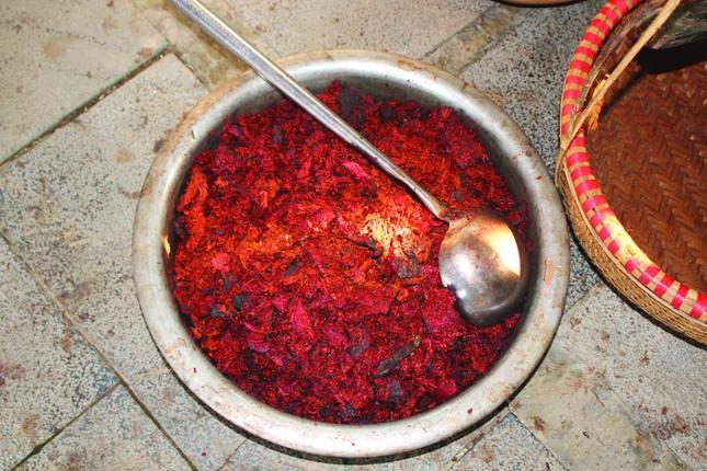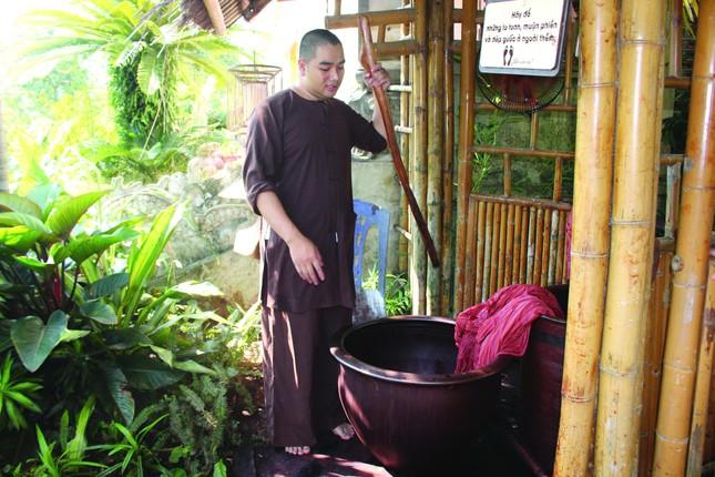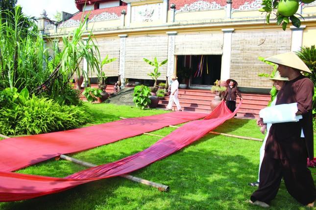 Thế nhưng, chỉ có củ nâu thôi liệu đã đủ để thành một tấm y cà-sa? Ngày trước, vải được dệt hoàn toàn từ sợi tự nhiên: tre, đay, lanh, bông hay tơ tằm. Vải thô sau khi dệt phải được nấu kỹ với tro hoặc vôi để sạch hồ, sạch sáp, rồi mới đưa vào nhuộm. Tất cả khởi đầu bằng sự mộc mạc, nhưng hàm chứa trong đó là cả một triết lý về sự thanh tịnh và bền bỉ. “Khi nhuộm, tâm phải tĩnh, tay phải đều. Vải nhuộm bằng sự kiên nhẫn mới giữ được màu nâu trầm như đất mẹ, như gốc rễ của người tu”, Đại đức Thích Giác Tuệ chia sẻ. Với thầy, mỗi tấm vải không đơn thuần là sản phẩm vật chất, mà còn là dấu ấn của giới luật. Mỗi công đoạn nhuộm vải ở chùa Cháy đều chất chứa yếu tố tâm linh. Gậy gỗ khuấy nhuộm phải là loại gỗ xưa, có sự truyền thừa. Người thợ nhuộm không dùng găng tay, trực tiếp cảm nhận nước nhuộm bằng da thịt, dù mùi ngai ngái vẫn bám riết. Thậm chí, nghề còn có những quy ước nghiêm cẩn: phụ nữ trong những ngày “không sạch” thì không được tham gia, bởi quan niệm vải sẽ “không ăn màu”. Phơi vải cũng trở thành một nghi thức: từng tấm vải được giăng trên đòn gánh, phần thừa thả xuống, lặp đi lặp lại như một điệp khúc thiền định. Ngày mưa hay nắng, các nghệ nhân vẫn kiên trì, coi đó là cách giữ nghề, giữ cội nguồn.