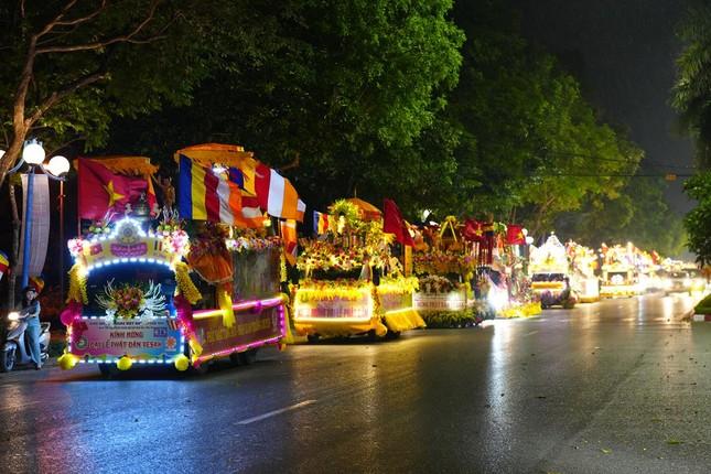 Sau khóa lễ cầu nguyện, gần 40 chiếc xe hoa rực rỡ sắc màu bắt đầu lăn bánh, tạo nên sự thiêng liêng và xúc động trong lòng những ai có duyên chứng kiến. Dẫn đầu đoàn là xe của Ban Trị sự GHPGVN TP.Hà Nội, tiếp nối là những chiếc xe hoa của Ban Trị sự Phật giáo các quận, huyện, đạo tràng, xe chiêng - trống, xe chư tôn đức và đông đảo Phật tử cùng nhân dân cùng đồng hành trên các tuyến đường.