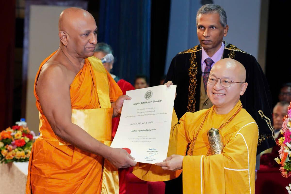 Ảnh: Hòa thượng GS.TS Kollupitiye Mahinda Sangharakkhita, Hiệu trưởng Đại học Kelaniya trang trọng trao Bằng Tiến sĩ Văn học danh dự đến TT.Thích Nhật Từ Buổi lễ năm nay có khoảng 650 sinh viên tốt nghiệp. Trong không khí long trọng, Thượng tọa Thích Nhật Từ được xướng danh là người Việt Nam đầu tiên nhận bằng danh dự của Đại học Kelaniya, ghi nhận những đóng góp nổi bật của Thầy trong nghiên cứu Phật học, hoằng pháp quốc tế và kết nối giao lưu Phật giáo Việt Nam – Sri Lanka.