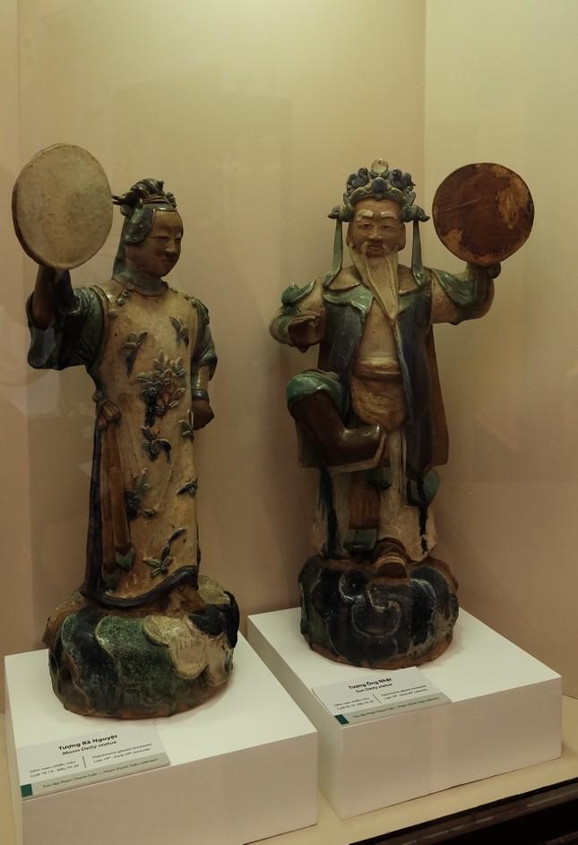 |  Cặp tượng ông Nhật bà Nguyệt thường được bài trí trên phần nóc tiền điện của các công trình chùa chiền, miếu vũ xưa tại miền Nam  |