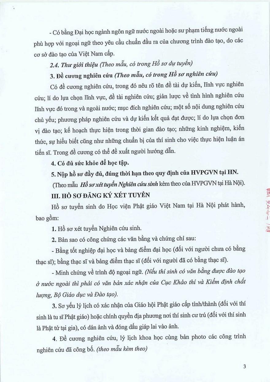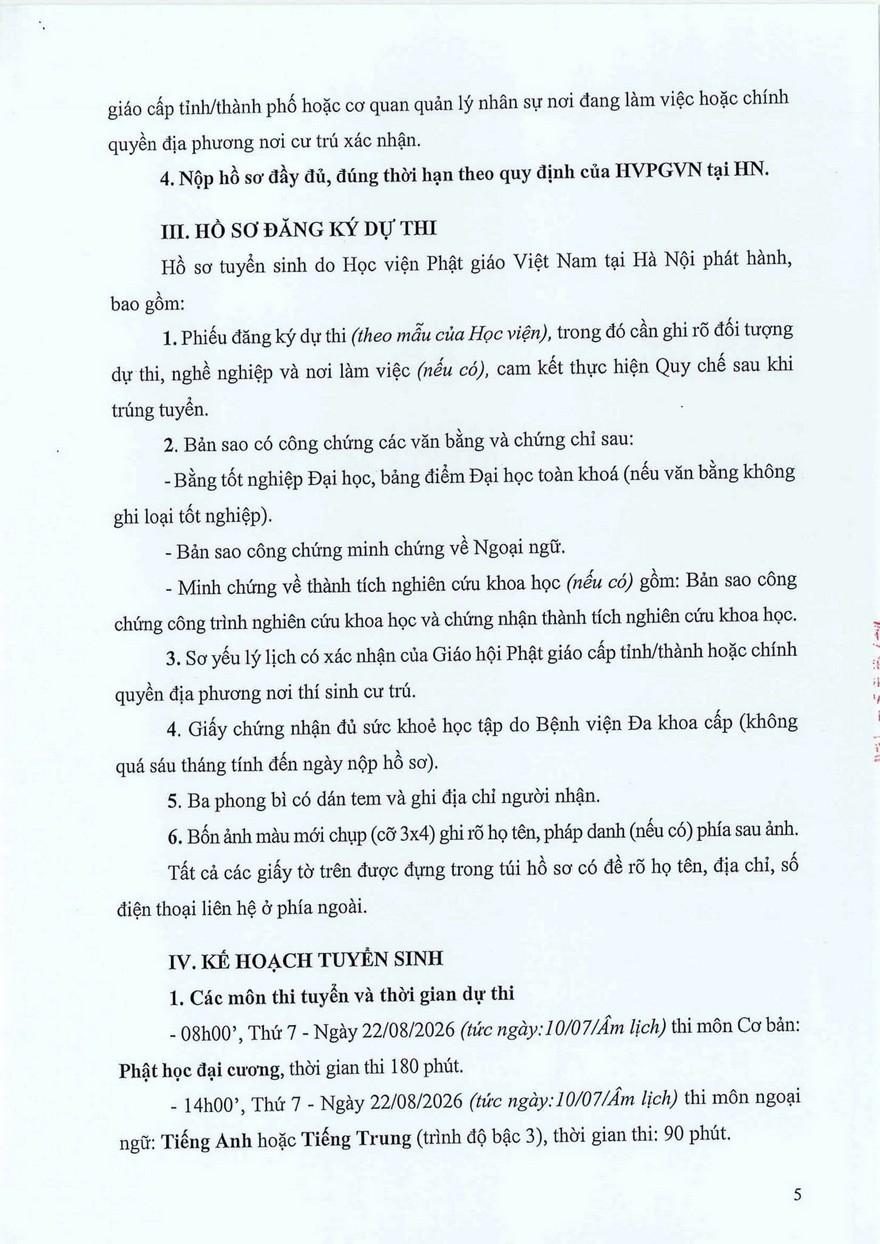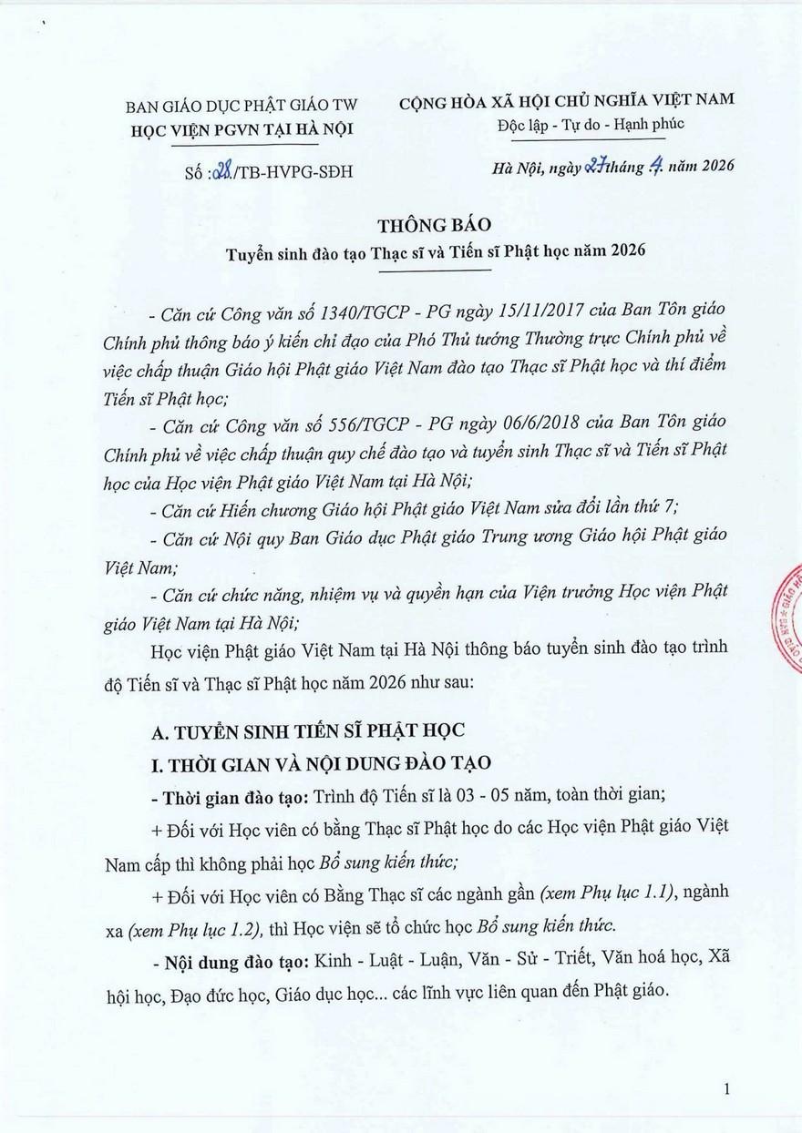 (PGNĐ) - Học viện Phật giáo Việt Nam tại Hà Nội thông báo tuyển sinh Thạc sĩ và Tiến sĩ Phật học năm 2026.